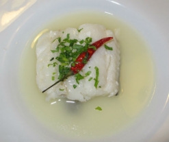 - Al acabar el programa, retire el bacalao y emulsione el pilpil triturando el líquido de la cubeta con una batidora.