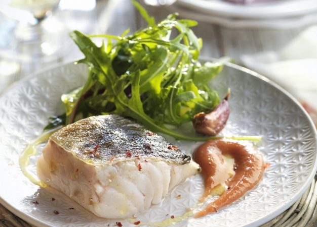 - Sirva de inmediato cada trozo de bacalao en un plato y cúbralo con la muselina de membrillo.
