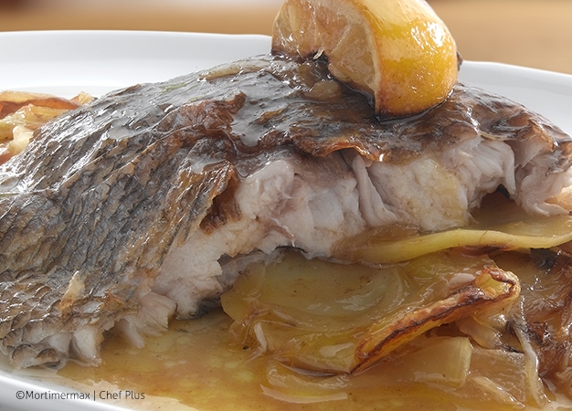 - Introduzca las patatas y la cebolla en la cubeta, vierta una medida de agua, disponga los lomos de besugo encima y programe el menú Pescados.