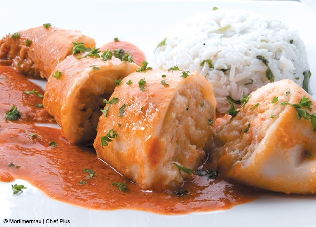 - Introduzca los calamares en la cubeta (encima de la salsa), cierre la tapa y programe el menú Pescados.