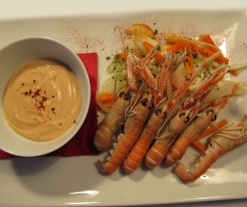 - A la hora de servir, distribuya las verduras escurridas por el fondo del plato y disponga las cigalas encima. Sirva la salsa aparte.
