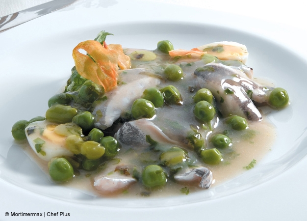 - Incorpore la guindilla y la harina a los ajos que quedan en la cubeta y remueva 1 minuto. Añada el caldo y el perejil y, cuando empiece a hervir, agregue las cocochas y sazone. Por último, cueza unos 5 minutos con los guisantes.