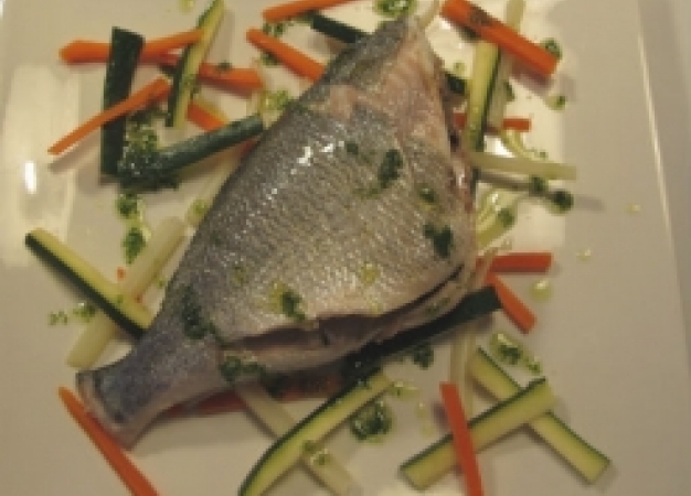 - Vierta el agua en la Chef Plus Induction. Disponga las verduras y los lomos de dorada encima de la bandeja de vapor y meta ésta en la cubeta.