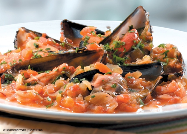 - Lave los mejillones con abundante agua, ráspelos con un cuchillo y elimine las barbas. Pique la cebolla, los ajos, los tomates y el perejil.