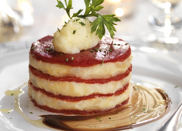 - Abra los pimientos del piquillo por un lado, de forma que queden como una lámina. Puede usar un aro de montaje para recortar el pimiento y montar luego. En cada plato ponga una cucharada de puré de brandada y encima una lámina de pimiento, siga con más brandada y pimientos intercalados hasta formar 6 capas.