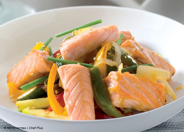 - Limpie y despunte las judías verdes; corte el pimiento, las zanahorias y el calabacín en dados medianos; trocee el salmón en dados grandes.