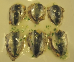 - Quite la piel del salmón y córtelo en dados pequeños; lave el perejil y píquelo; machaque las almendras y el ajo en el mortero. Mézclelo todo y rellene las sardinas con la pasta resultante.
