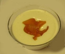 - En el momento de servir, corte la gelatina (el puré se habrá convertido en gelatina) en tiras finas o cubos, y distribúyalos por encima de la crema de mascarpone preparada en el paso 1.