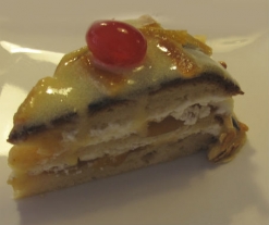 - Monte la tarta por capas, en el siguiente orden: bizcocho, confitura, nata, bizcocho, confitura, nata, bizcocho. Deje enfriar.