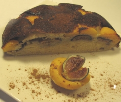 - Engrase el fondo de la cubeta y espolvoree el azúcar glas. Disponga en el fondo los gajos de melocotón y cúbralos con una capa de masa; ponga encima una capa de higos y cúbrala con el resto de la masa.