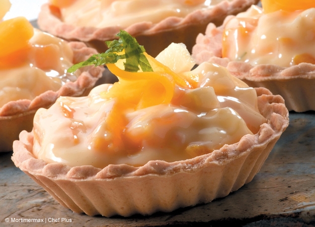 - Rellene las tartaletas de masa quebrada con este relleno y decore con las láminas de melocotón y la menta.
