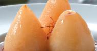 Peras con almíbar de azafrán y cacao