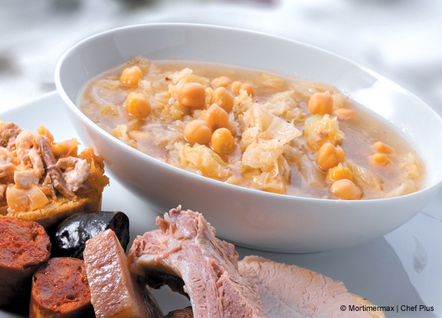 - Introduzca la carne, la punta de jamón, el tocino, los garbanzos, la gallina, el ajo y la cebolla en la Chef Plus Induction; cubra con el agua.
