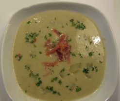 - Añada el aceite de oliva a la crema y decórela con el perejil y las tiras de jamón. Sirva caliente.
