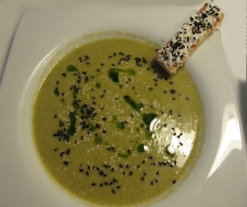 - Introduzca el brécol, el puerro, la cebolla, el aceite de semillas de sésamo y una pizca de sal en la cubeta; vierta las 4 medidas de agua.
