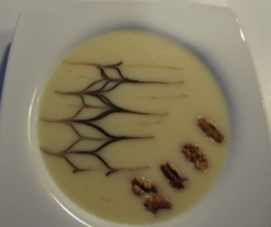 - Sirva la crema caliente, decorada con las nueces enteras reservadas en el paso 1.