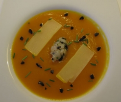 - Sirva la crema en boles individuales y disponga una loncha de queso y el bacalao desalado encima. Puede decorar con unas aceitunas negras y unas hojas de cebollino.