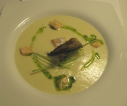 - Pele y corte los puerros y la patata en trozos grandes; pele y pique el ajo y la cebolla. Corte el salmón en 4 lomos, eliminando la piel y las espinas; salpimiente.