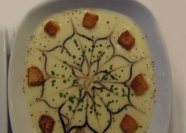- Al terminar, traslade el contenido de la cubeta a otro recipiente y triture. Añada la nata y cuele (si lo desea); rectifique la sal y espolvoree el cebollino antes de servir. Esta sopa se toma fría, pero si desea tomarla caliente también resulta deliciosa.