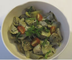 - Disponga las alcachofas, el ajo y una cucharada de menta picada con el aceite en la cubeta. Salpimiente, remueva y vierta las 3 medidas de agua.