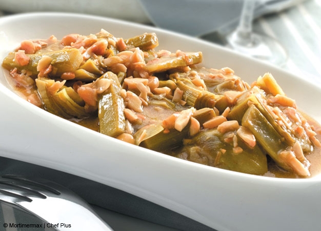 - Pique el jamón y lamine los ajos; corte las alcachofas en láminas gruesas.
