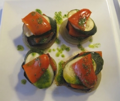 - Corte las berenjenas en rodajas finas, colóquelas en un colador y deje que suelten el líquido. Corte el calabacín y la cebolla en rodajas de 2 centímetros. Limpie las demás verduras y lamínelas.