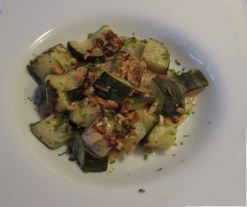 - Limpie y trocee los calabacines en cuartos. Pele el pepino, córtelo por la mitad a lo largo y quítele las semillas con la ayuda de una cucharilla; córtelo en dados del mismo grosor que el calabacín.
