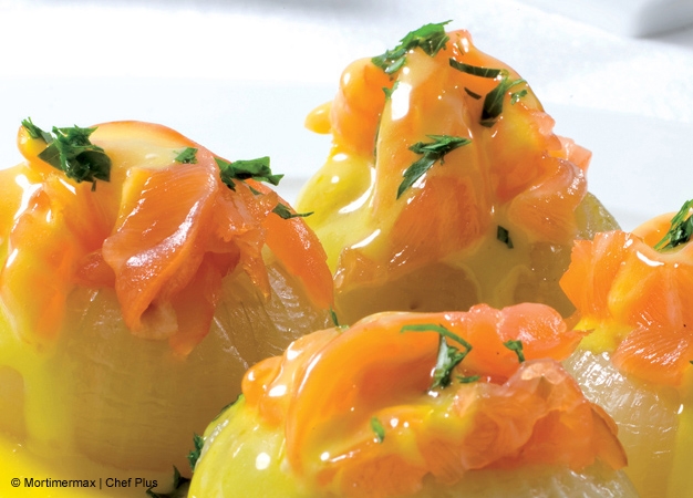 - Trocee el salmón y mézclelo con la otra mitad de sofrito; rellene las cebollas huecas con esta mezcla.