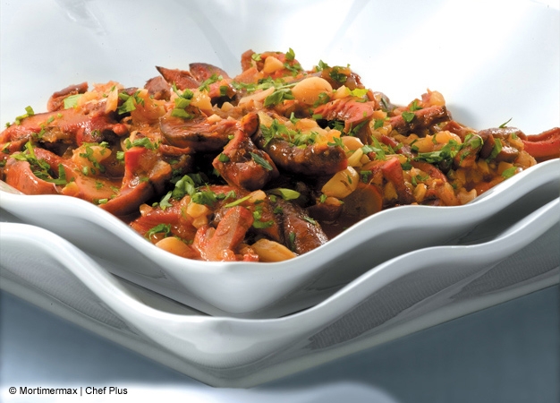 - Programe el menú Freír/Sofreír 15 minutos a 180º y vierta el aceite en la cubeta. Dore los ajos durante 3 minutos antes de agregar la cebolla y rehogue hasta que esté transparente. Incorpore los níscalos y saltéelos 5 minutos sin parar de remover; salpimiente y agregue el tomate, las almendras y el champán.
