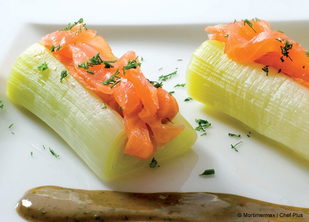 - Haga un corte longitudinal en la parte superior de los puerros y retire las hojas centrales; con las exteriores realice un cilindro y rellénelo con el preparado de salmón. Sirva espolvoreado con eneldo y la salsa de miel.