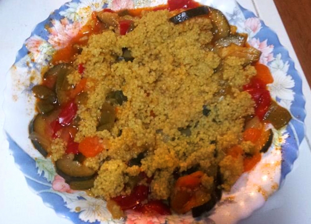 7. Servimos las verduras y añadimos cuscús al gusto. Lo podemos acompañar con tomate triturado envasado o tomate maduro natural.